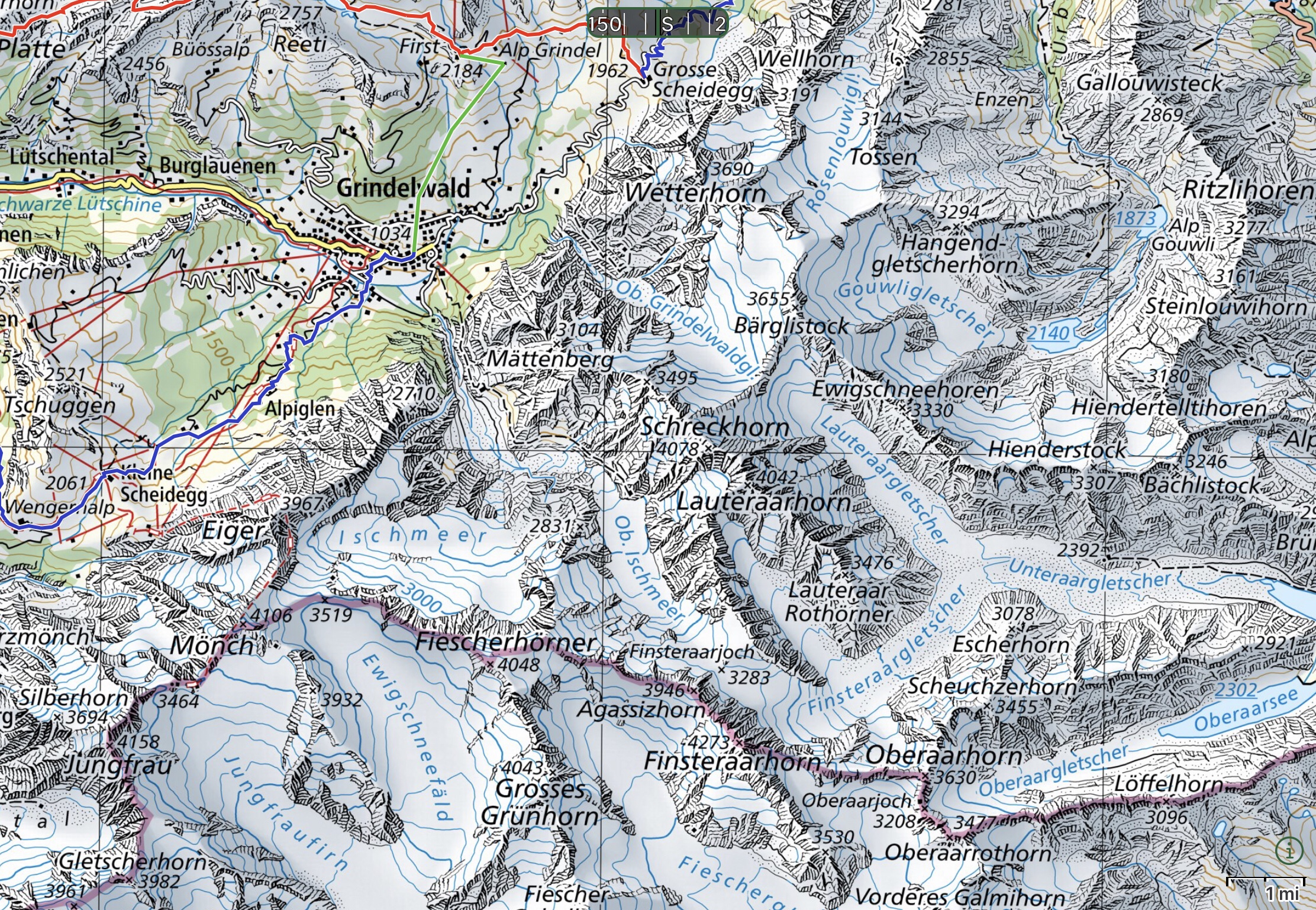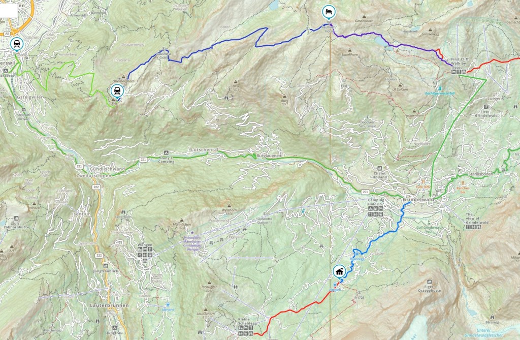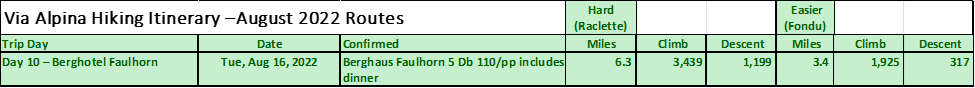 This is our half-way point celebration. Patti and I stayed at the top during a Thunderstorm many years ago. The hotel has tiny double rooms with just a basin and a pitcher of water. Ours looked out over the valley. We will have a lovely dinner together. There are two ways to get to the top: 1) Riding the train up to Wilderswil and up to Schynige Platte, this has nice 6.3Mi hike above 2,000m. 2) Ride the train or hike to Grindelwald and take the lift up to First and then a 3.5Mi hike. Neither hike is difficult to the Faulhorn.
