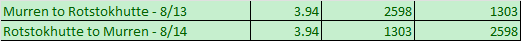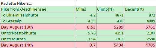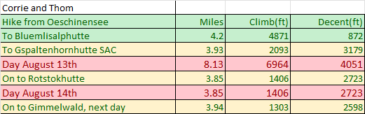 2) Easier plan is to have a leisure morning at the Lake, those who stayed down in Kandersteg can take the lift up in the morning, play in the Lake or hike either side of the Lake halfway to the end. Then take the lift back down from Oeschinensee and then the train all the way to Murren and hike back out to the Rotstockhutte, to overnight in that hutte. We would need to leave early enough from the Lake to catch the 12:15 train to get to Murren early enough to hike out. The next morning Day 8, we can explore the high country below the Schilthoren..…have lunch and move on to Alpiglen where we spend Night 8 & 9. Patti prefers this option as she and I already hiked over Hohturli. We could all do this. If you don’t take the lift down and want to hike to Kandersteg it’s about another 2.1 miles and 1,700ft. But we may be short on time. For now, I have 10 beds reserved for the main group at Rotstockhutte. Even room for Corrie and Thom if the weather turns bad.