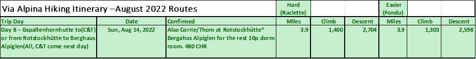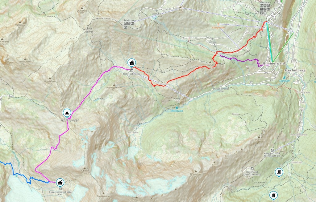If on Day 7 we hiked out to Rotstockhutte to overnight, we just have to hike back. Mostly downhill now, and just a couple of hours walk. Corrie and Thom who hiked the day before over Hohturli and on to Gspaltenhornhutte will have to do the hike up to the hutte, but plan to spend most of the day in the Glacier Region. They will join us on Day 9 again. BTW. One can hike directly down from Spielbodenalp to Gimmelwald or take the lift from Murren.