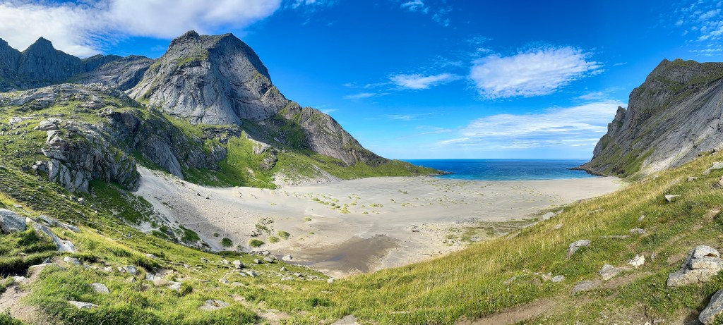 Sun blue sky blueberries red berries fish farm fish smell speed boat trip cold or hot Husøy herbed salmon narrow roads tunnels bridges fjords hikes views beaches fine sand pasta vegetables salad fishstock fish cooking together walking together views ferries harbors coastline villages Vikings Museum rowing supping personal history of Vaeroy NATO hike mountain peaks long sunsets brief darkness Eggum beach walks. Secret beach in Senja and Vaeroy (PunnSanden) fresh bread sandwiches green wildflowers 4-leaf clovers sea gulls puffin’s eagles otters
